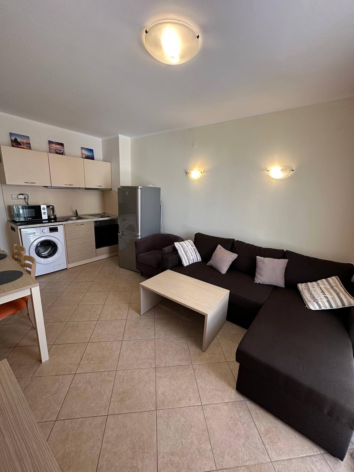 Планировка классическая: гостиная с кухонной зоной и отдельная спальня. Формат самый востребованный на курорте — подходит для проживания, отдыха и аренды.